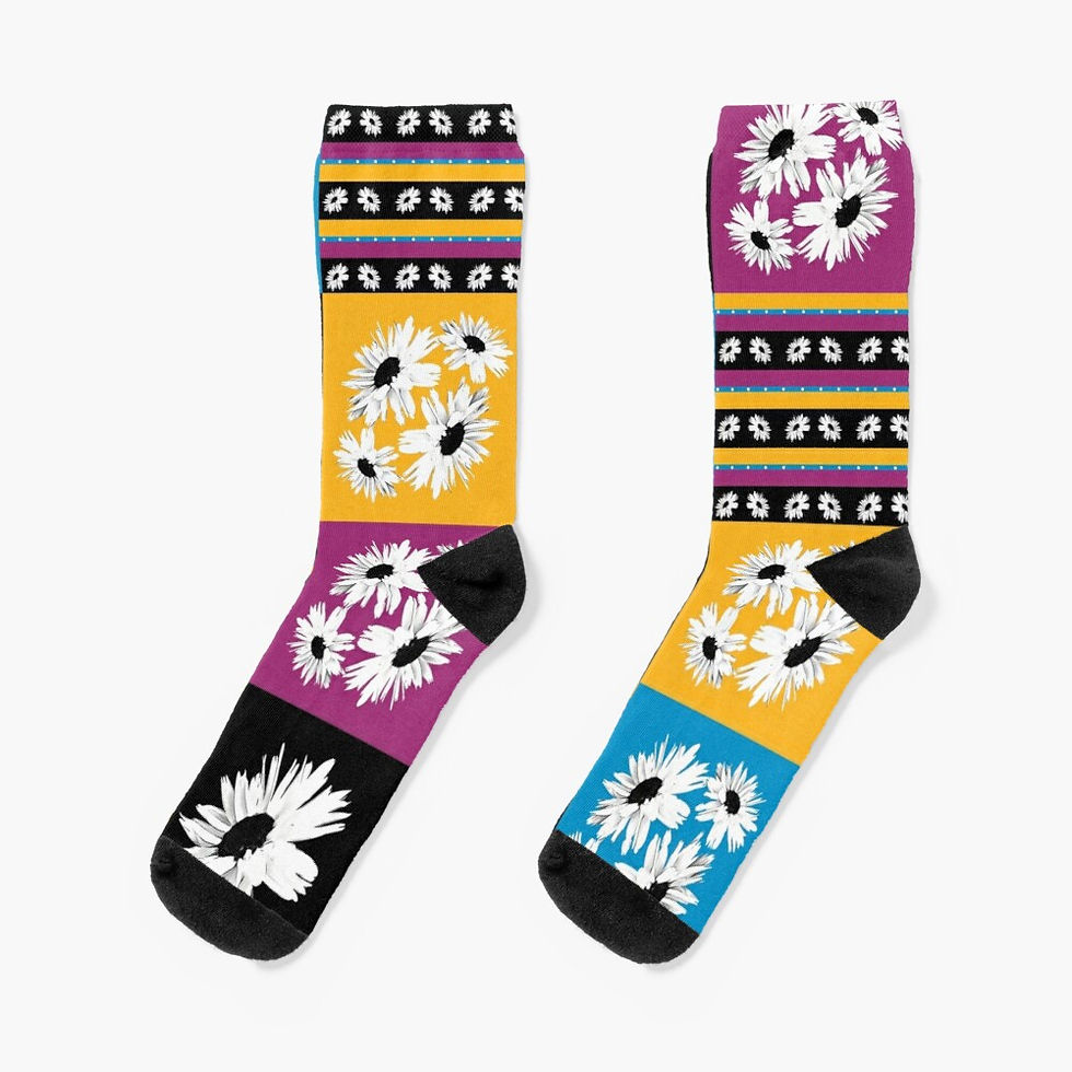 Funky socks (polyester and cotton blend) featuring the artwork of Poppy Pod CBA.